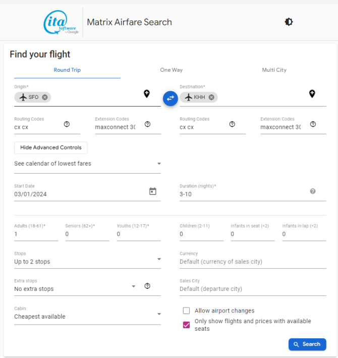 - The Matrix Airfare Search by ITA Software search page should be like below when all values are inputted