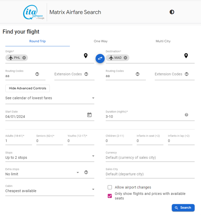 The Matrix Airfare Search by ITA Software search page should be like below when all values are inputted