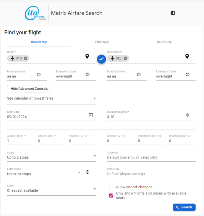 The Matrix Airfare Search by ITA Software search page should be like below when all values are inputted