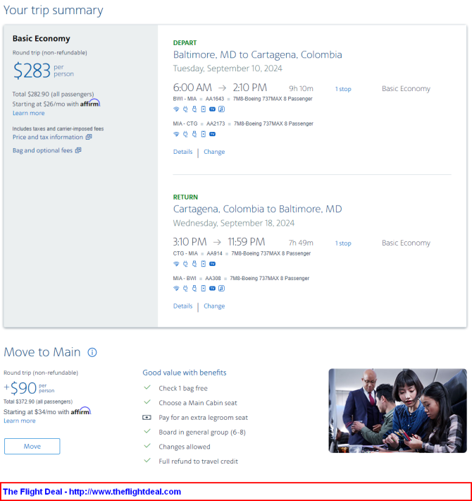 BWI -MIA (Miami) – CTG (Cartagena) – MIA – BWI