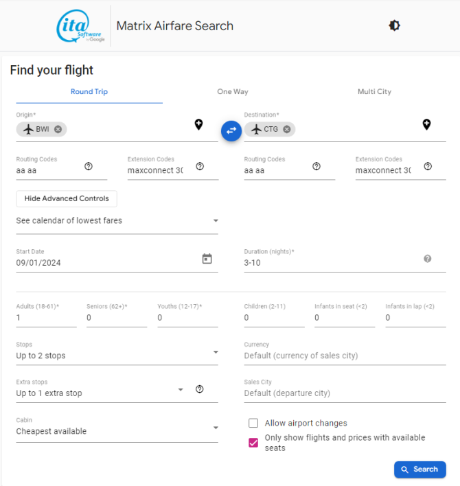 The Matrix Airfare Search by ITA Software search page should be like below when all values are inputted
