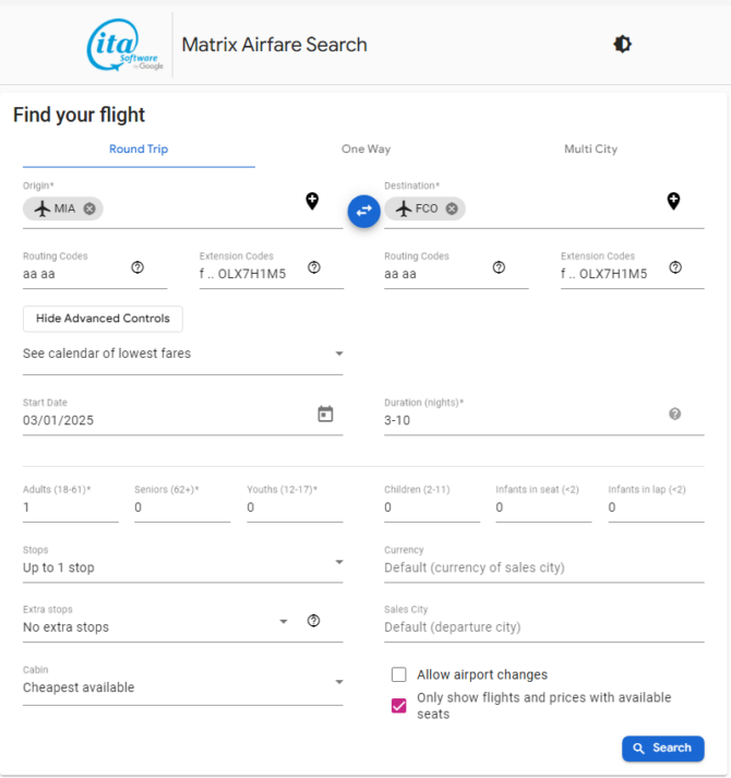 The Matrix Airfare Search by ITA Software search page should be like below when all values are inputted