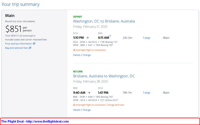 DCA – DFW (Dallas) – BNE (Brisbane) – DFW – DCA
