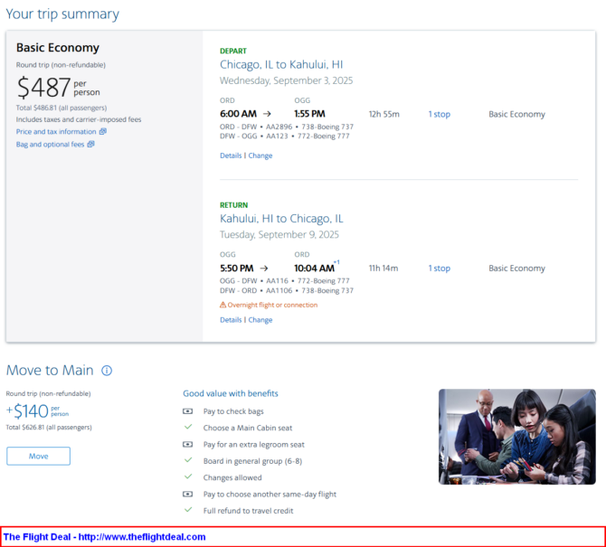 ORD – DFW (Dallas) – OGG (Maui) – DFW – ORD