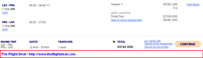 - LAX – CPH (Copenhagen) – PRG (Prague) – CPH – LAX