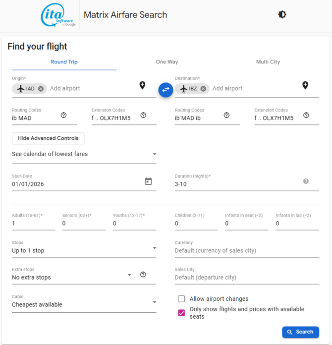 - The Matrix Airfare Search by ITA Software search page should be like below when all values are inputted