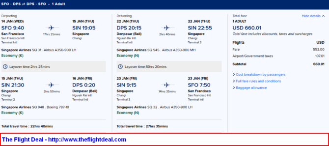 - SFO – SIN (Singapore) – DPS (Bali) – SIN – SFO