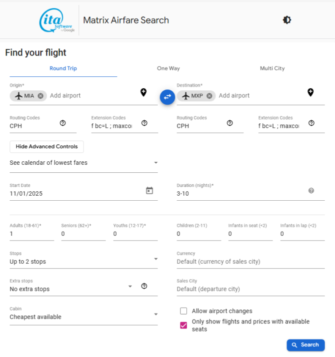 • The Matrix Airfare Search by ITA Software search page should be like below when all values are inputted