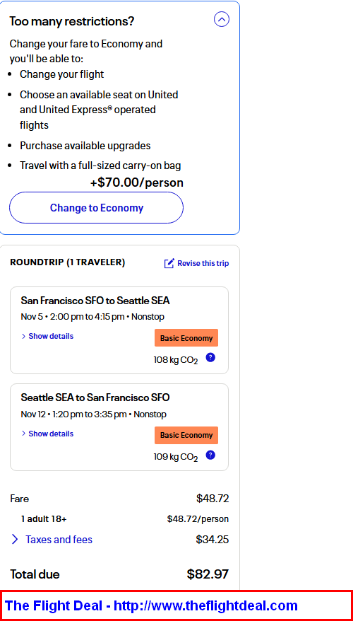 The Shorthaul – United: San Francisco – Seattle, Washington (and vice versa). $83 (Basic Economy) / $153 (Regular Economy). Roundtrip, including all Taxes