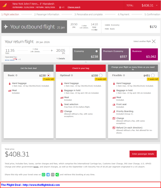• JFK – MAD (Madrid) – RAK (Marrakech) – LHR (London) – JFK