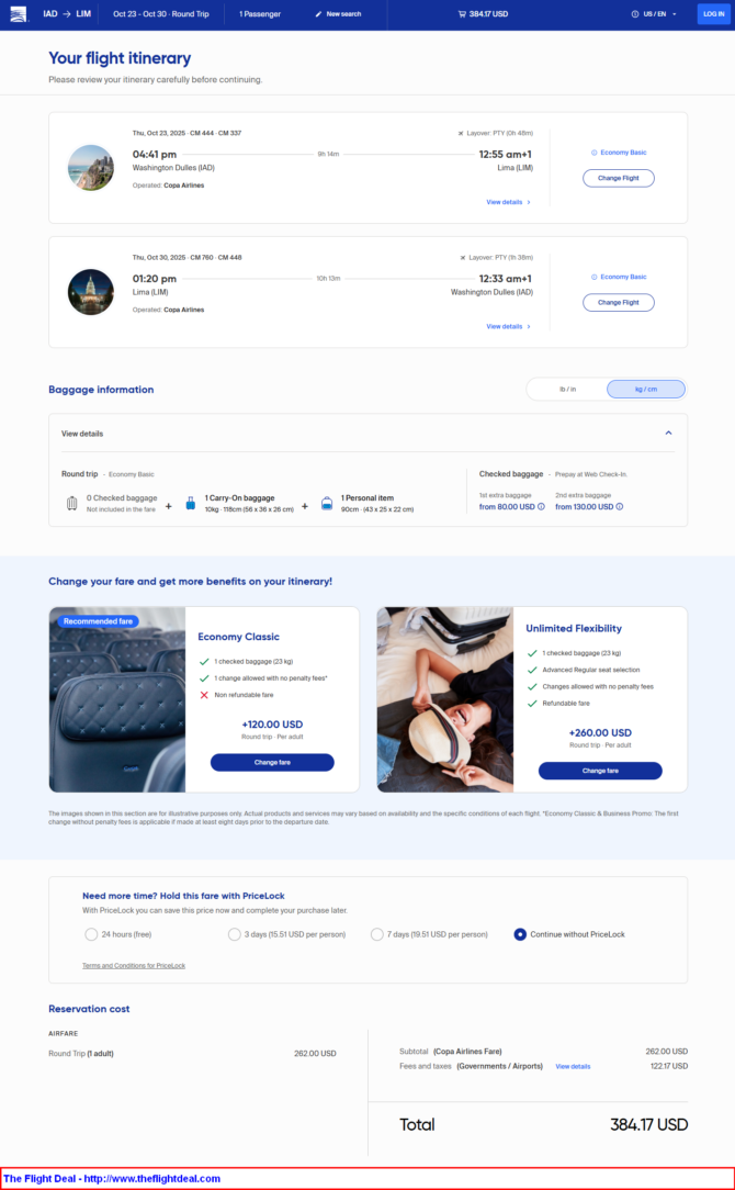 - IAD – PTY (Panama City) – LIM (Lima) – PTY – IAD