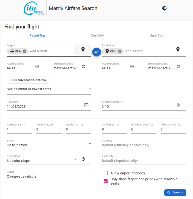 The Matrix Airfare Search by ITA Software search page should be like below when all values are inputted