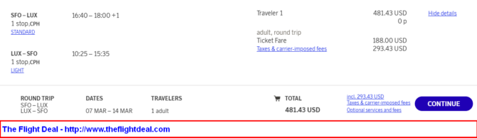 - SFO – CPH (Copenhagen) – LUX (Luxembourg) – CPH – SFO