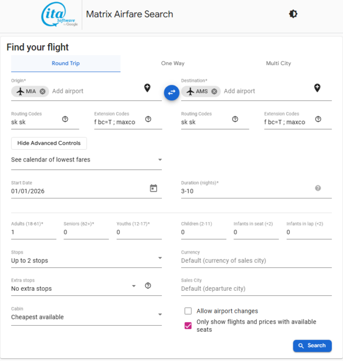 - The Matrix Airfare Search by ITA Software search page should be like below when all values are inputted