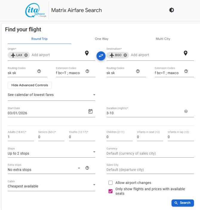 • The Matrix Airfare Search by ITA Software search page should be like below when all values are inputted