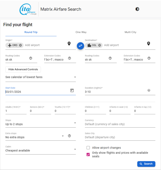 - The Matrix Airfare Search by ITA Software search page should be like below when all values are inputted