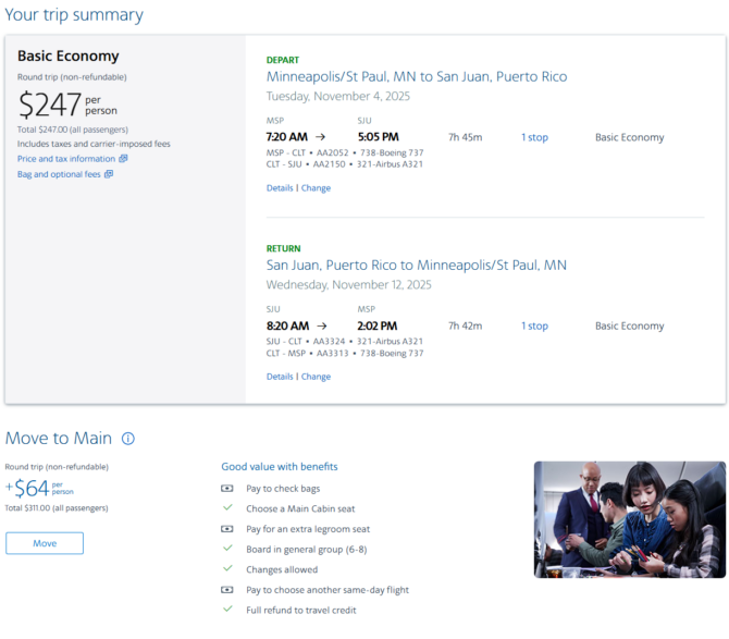 - MSP – CLT (Charlotte) – SJU (San Juan) – CLT – MSP