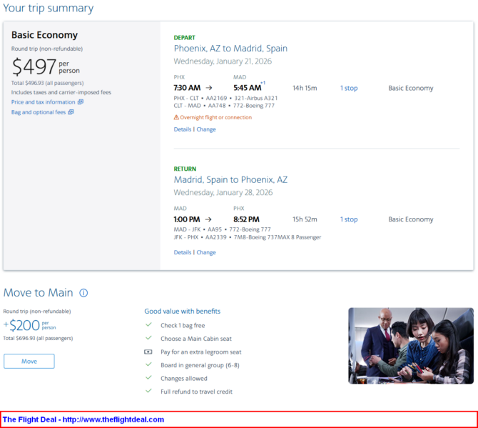 PHX – CLT (Charlotte) – MAD (Madrid) – JFK (New York) – PHX