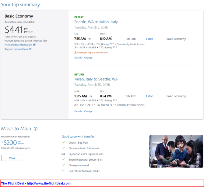 SEA – JFK (New York) – MXP (Milan) – JFK – SEA
