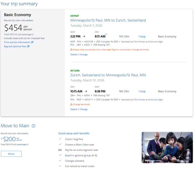• MSP – PHL (Philadelphia) – ZRH (Zurich)  – PHL – MSP