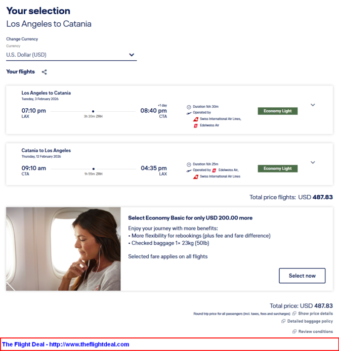 - LAX – ZRH (Zurich) – CTA (Catania) – ZRH – LAX