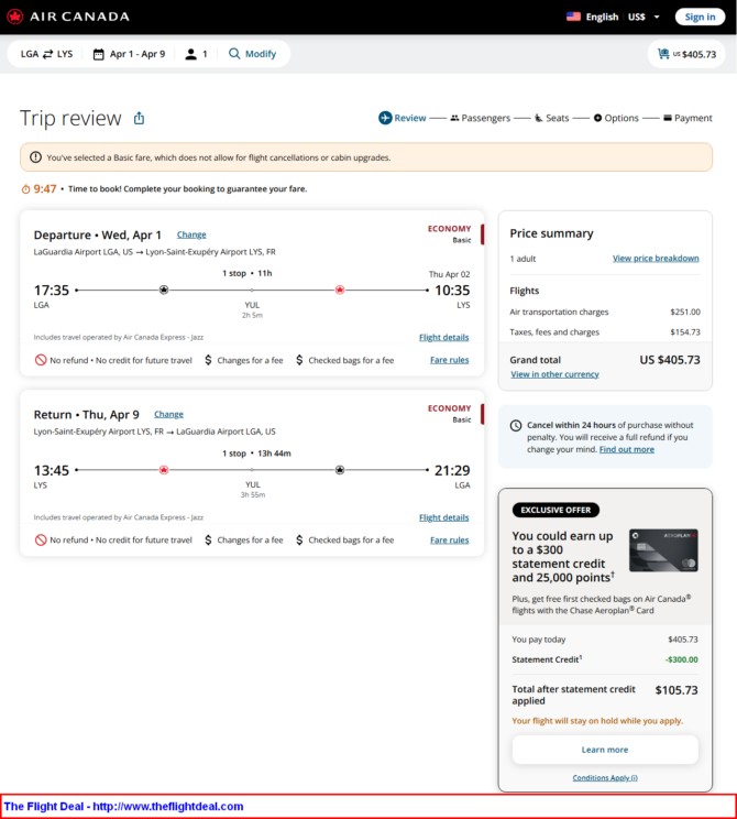 - LGA – YUL (Montreal) – LYS (Lyon) – YUL – LGA