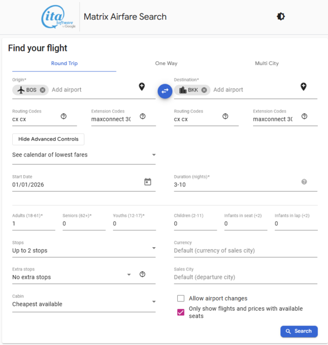 • The Matrix Airfare Search by ITA Software search page should be like below when all values are inputted