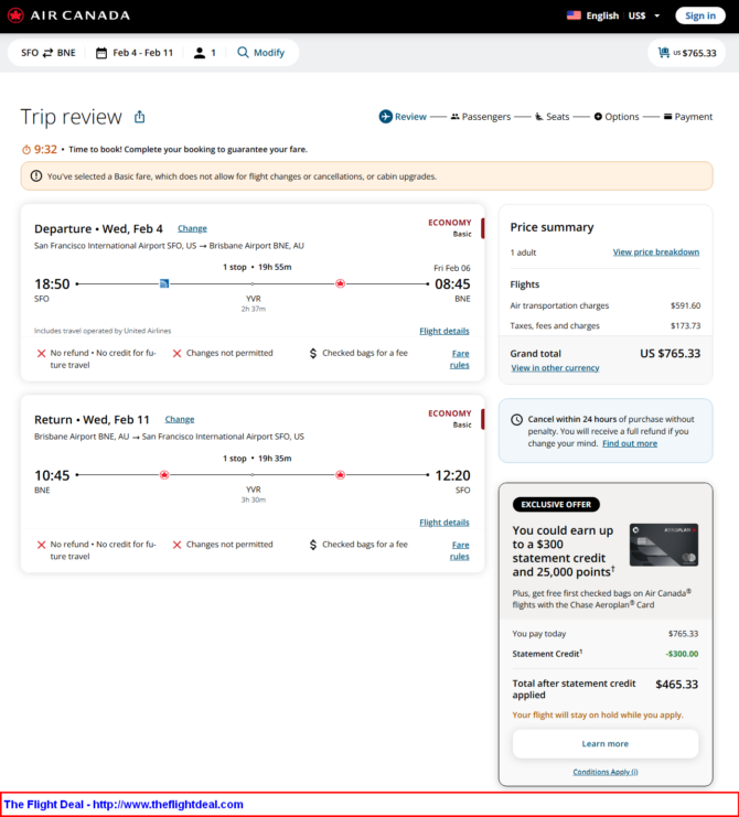 • SFO – YVR (Vancouver) – BNE (Brisbane) – YVR – SFO