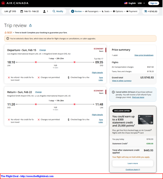 - LAX – YVR (Vancouver) – SYD (Sydney) – YVR – LAX