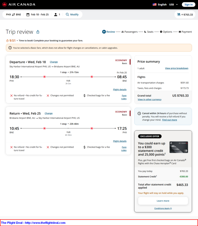 - PHX – YVR (Vancouver) – BNE (Brisbane) – YVR – PHX