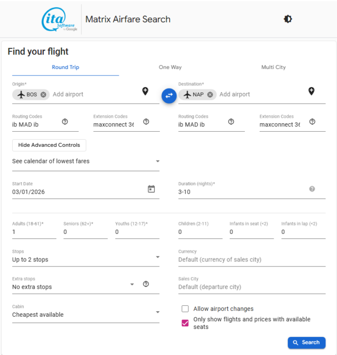 - The Matrix Airfare Search by ITA Software search page should be like below when all values are inputted
