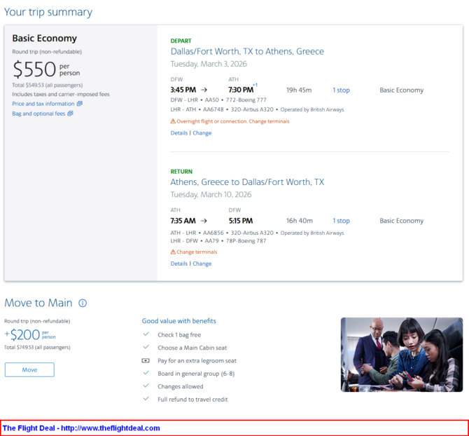 DFW – LHR (London) – ATH (Athens) – LHR – DFW