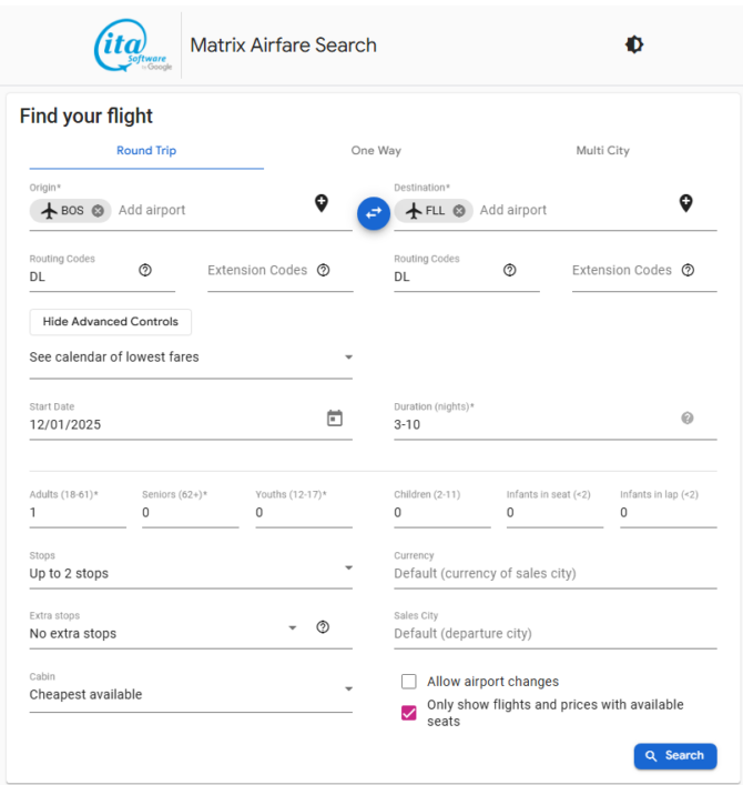 This works both ways, so FLL can be the Origin city and BOS can be the Destination