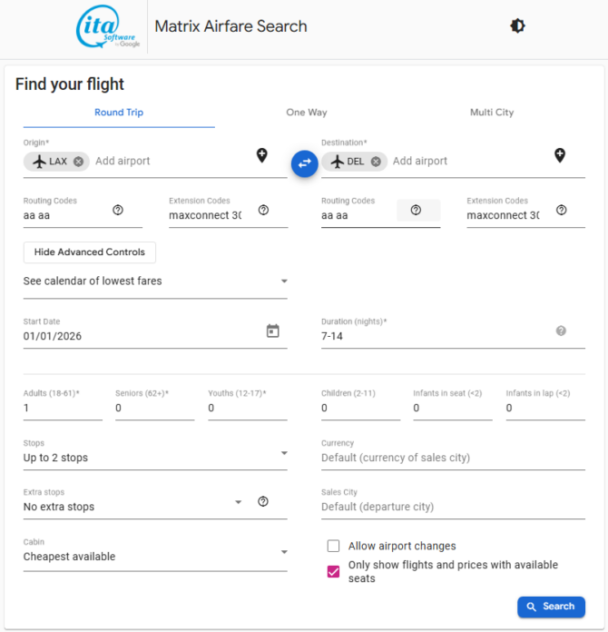 The Matrix Airfare Search by ITA Software search page should be like below when all values are inputted