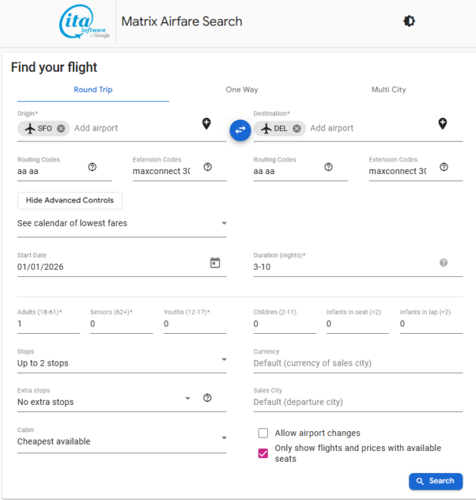The Matrix Airfare Search by ITA Software search page should be like below when all values are inputted