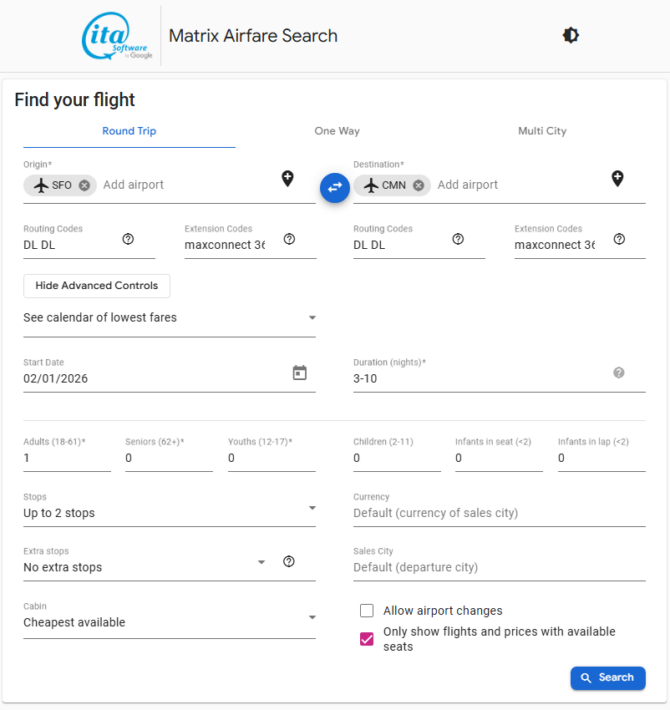 • The Matrix Airfare Search by ITA Software search page should be like below when all values are inputted