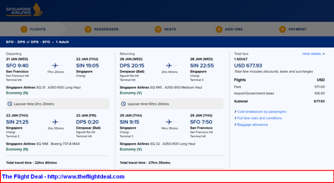 - SFO – SIN (Singapore) – DPS (Bali) – SIN – SFO