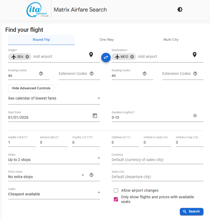The Matrix Airfare Search by ITA Software search page should be like below when all values are inputted