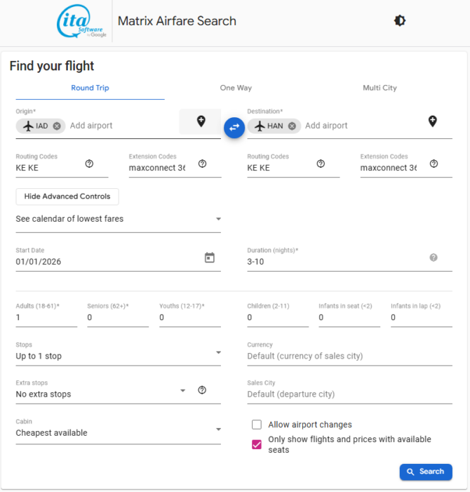 - The Matrix Airfare Search by ITA Software search page should be like below when all values are inputted