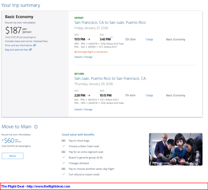 SFO – PHL (Philadelphia) – SJU (San Juan) – PHL – SFO