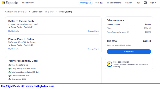 • DFW – HKG (Hong Kong) – PNH (Phnom Penh) – HKG – DFW