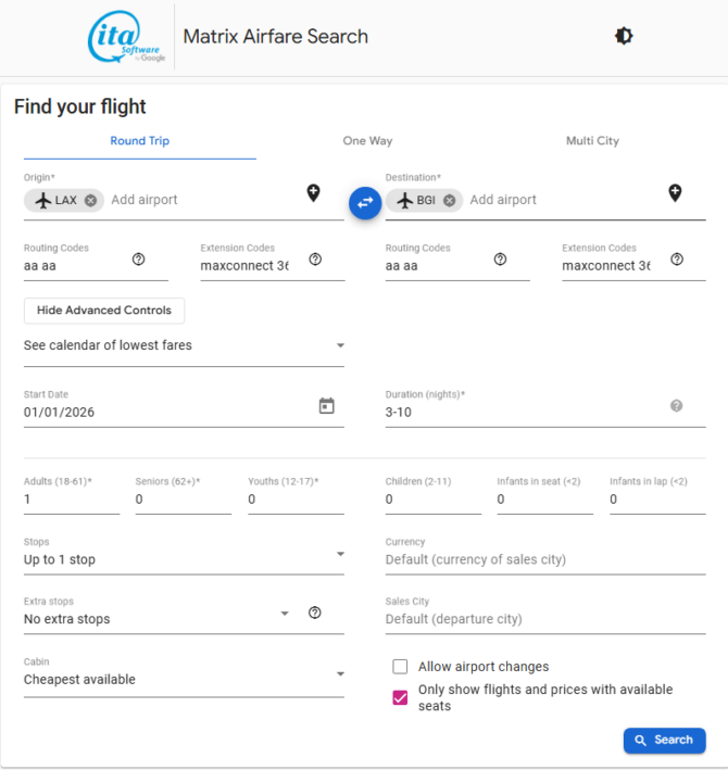 • The Matrix Airfare Search by ITA Software search page should be like below when all values are inputted