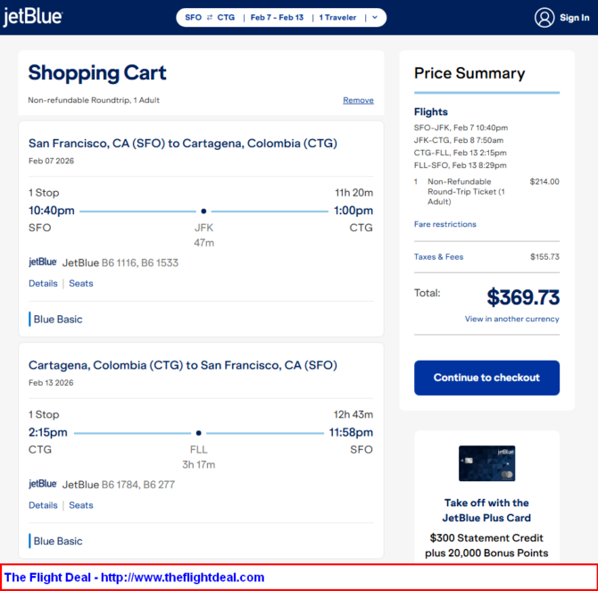 • SFO – JFK (New York)  – CTG (Cartagena) – FLL (Fort Lauderdale) – SFO