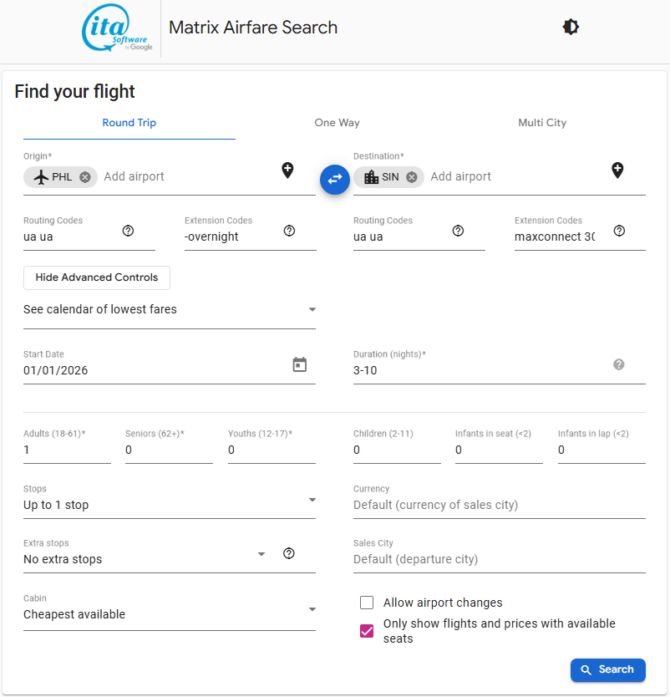 • The Matrix Airfare Search by ITA Software search page should be like below when all values are inputted