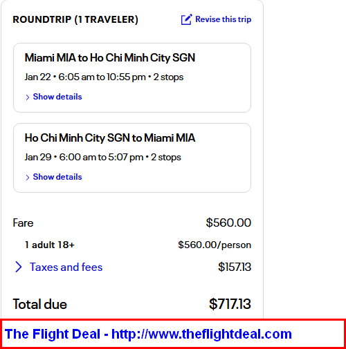 • MIA – SFO (San Francisco) – HKG (Hong Kong) – SGN (Ho Chi Minh City) – HKG – SFO – MIA