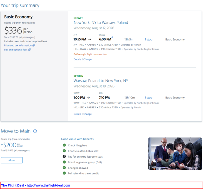JFK – HEL (Helsinki) – WAW (Warsaw) – HEL – JFK