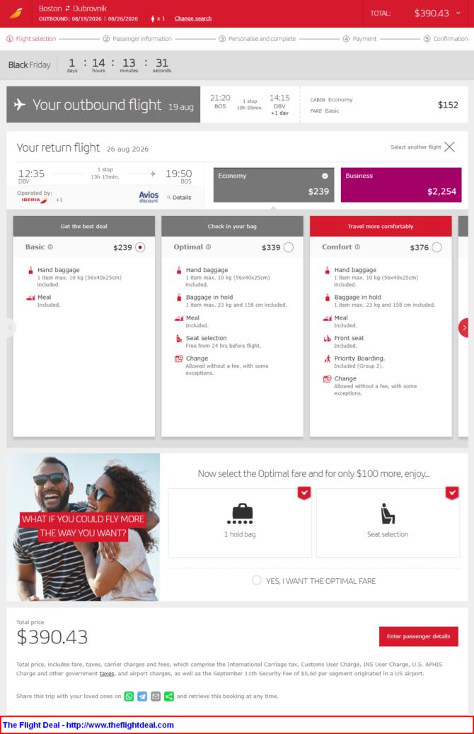 - BOS – MAD (Madrid) – DBV (Dubrovnik) – MAD – BOS