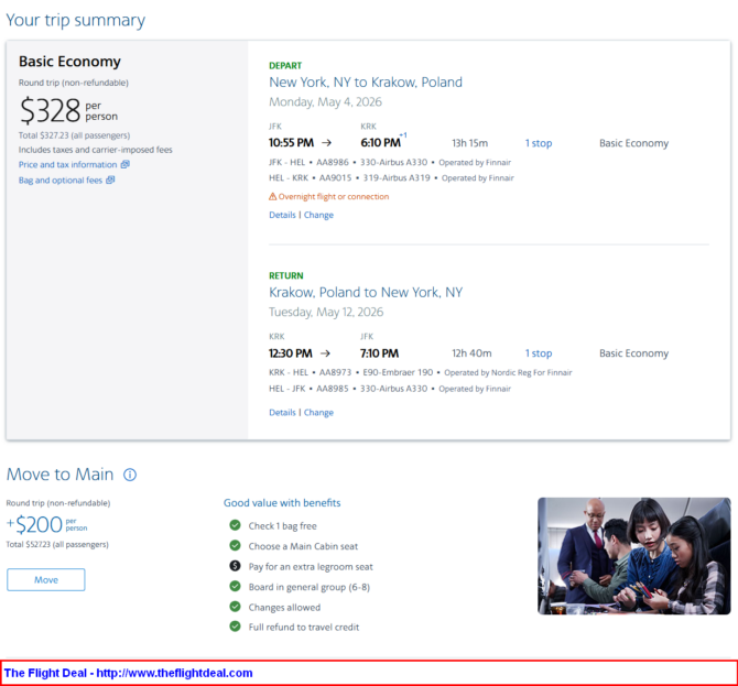 • JFK – HEL (Helsinki) – KRK (Krakow)  – HEL – JFK