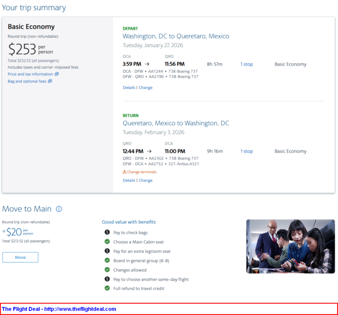 • DCA – DFW (Dallas) – QRO (Santiago de Querétaro) – DFW – DCA