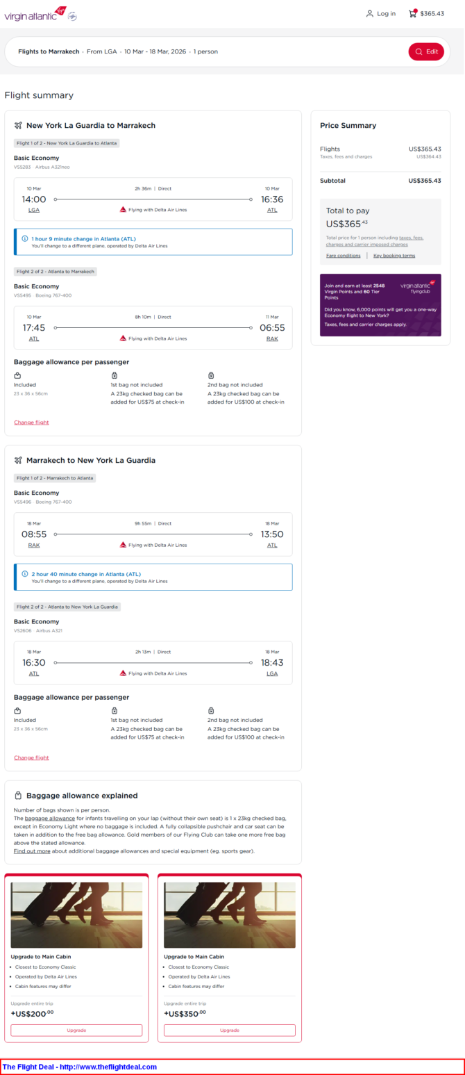 - LGA – ATL (Atlanta) – RAK (Marrakech) – ATL – LGA